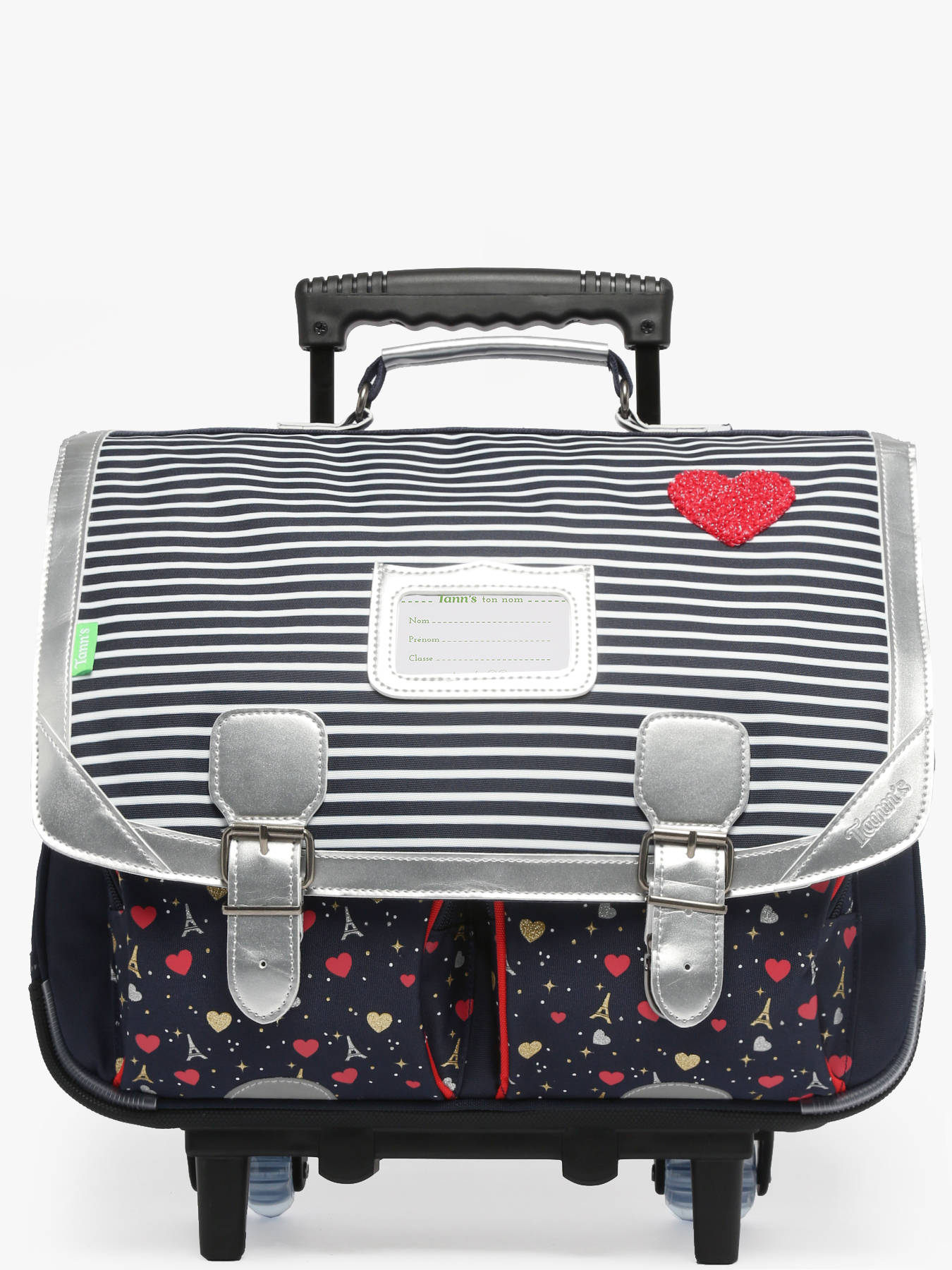41 cm - 20 liters - 2.5 kg ~ Ideal for the last two years of primary school, this two-compartment wheeled schoolbag from the brand TANN’S is made from recycled polyester, combining durability with environmental friendliness. Its flap with a secure clasp keeps personal belongings safe. It features two practical front pockets for keeping small items within easy reach, and adjustable shoulder straps for comfortable carrying when worn on the back. Inside, its two spacious compartments and two zipped pockets allow for optimal organization of school supplies. Its generous capacity can accommodate an A4 folder, notebooks up to 24x32 cm, as well as an accounting binder. This wheeled schoolbag is the perfect combination of style, practicality, and strength to accompany children throughout their school days.