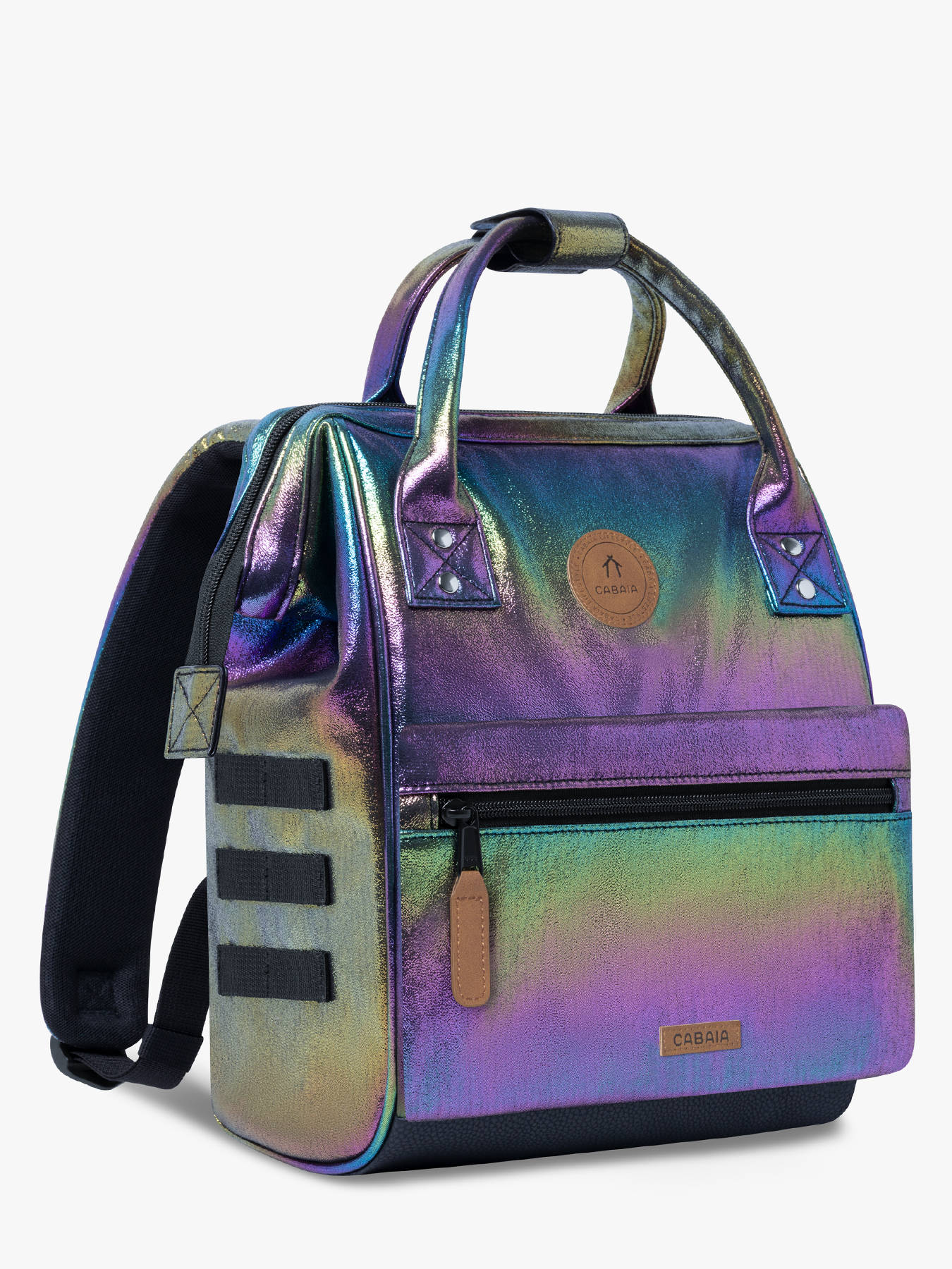 Adoptez le sac à dos vegan signé Cabaia ! Ce sac à dos Mini sera votre compagnon idéal, aussi bien pour les cours que pour voyager. On craque pour sa poche frontale amovible et interchangeable. Réalisé à partir de Nylon 900D la toile est très résistante. Ce sac à dos ados dispose d'une ouverture ""cabas"" grand angle donnant accès à un grand compartiment principal pouvant contenir un Ipad (hauteur 28 cm x largeur 21 cm x épaisseur 2 cm) à ranger dans la poche renforcée et du format cahiers A4. Très pratique, ce sac à dos sera également parfait pour transporter vos affaires lors d'un weekend, comme 1 jeans, 2 tee shirt, des sous-vêtements, une trousse de toilette et une tablette. Pour plus de confort et résistance, le fond est renforcé, le dos est rembourré et les bretelles sont molletonnées et anti-transpirantes. Au dos du sac, une poche zippée a été prévue pour ranger les petits effets personnels. Il y a également au dos une poche zippée spéciale pour glisser son téléphone portable ! On retrouve, sur le devant du sac à dos jeune un système de poche inviolable et breveté (système MOLLE) qui vous permet de personnaliser votre sac selon vos goûts. Deux poches zippées interchangeables sont fournies avec le sac à dos. Vous pouvez également ajouter des petites pochettes amovibles sur les côtés pour le personnaliser !