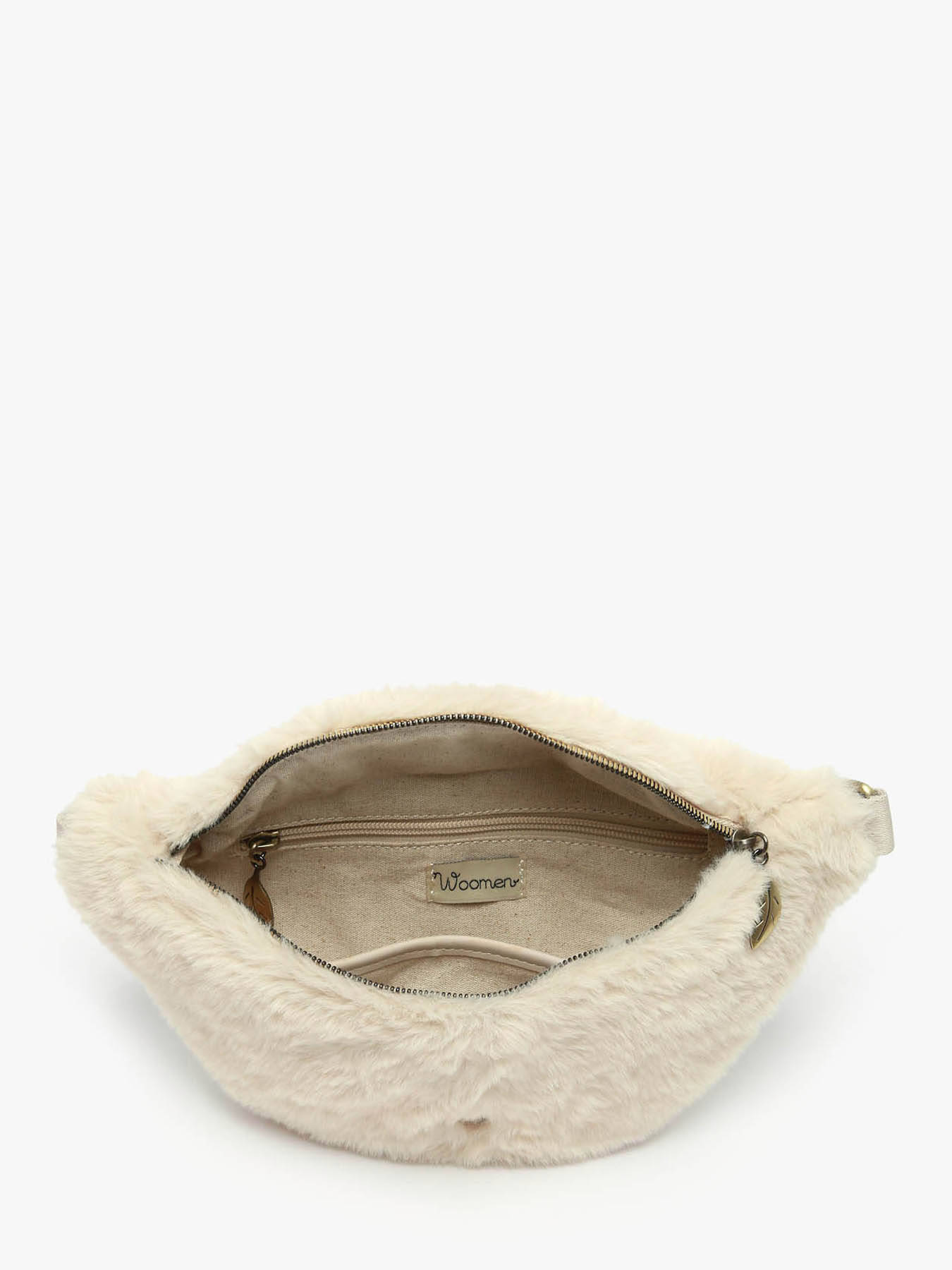 The WOOMEN belt bag from the OLIVIER line, crafted in soft plush material, stands out with its elegant metal logo and adjustable, removable nylon strap for wear at the waist or across the chest. Made from polyester with a cotton and linen lining, it features a zip closure and a functional interior with a slip pocket, a zipped pocket, and a single main compartment—combining style, comfort, and practicality for everyday use.