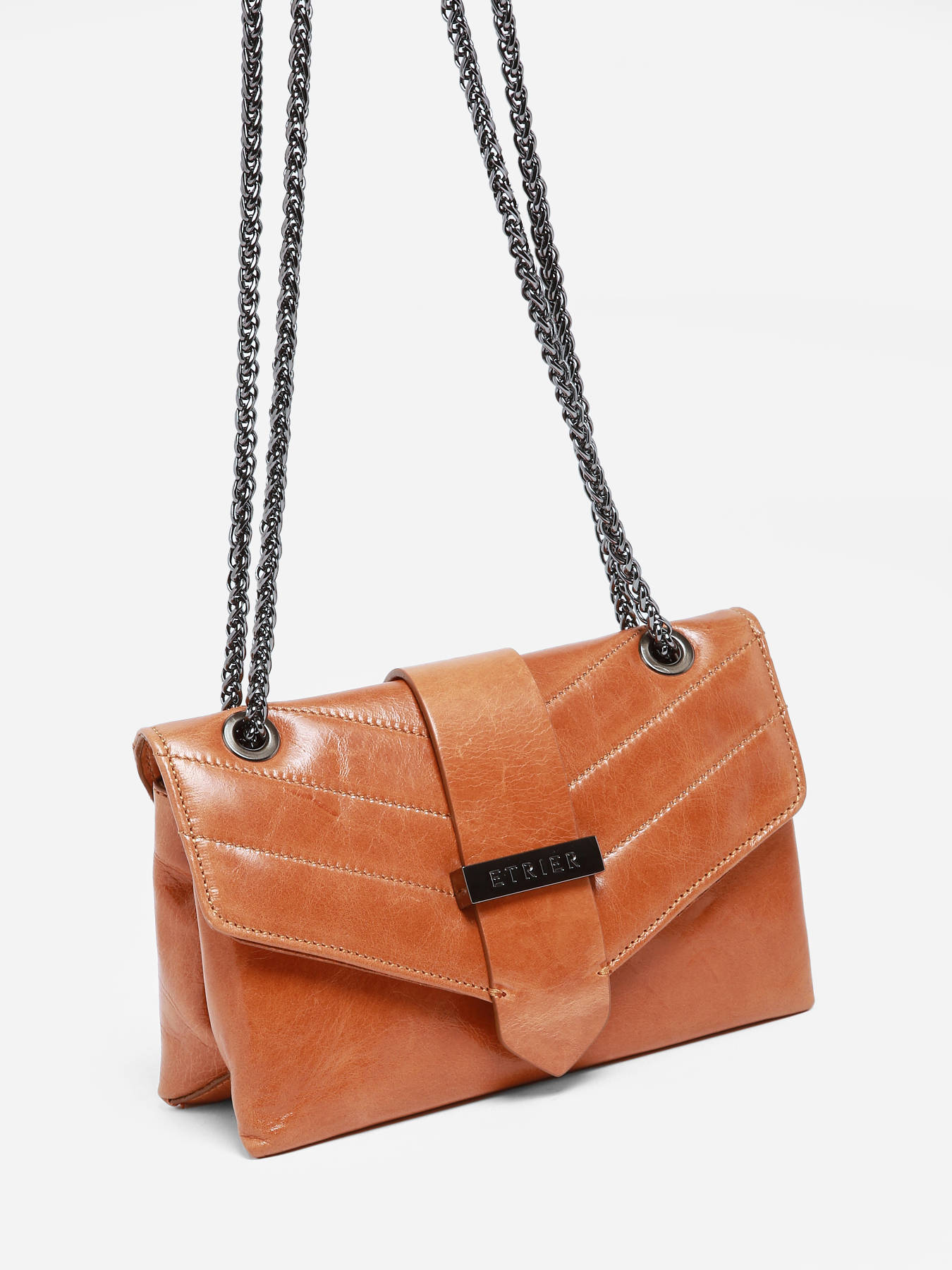 The ETRIER JANA AMOUR crossbody bag is available in two sizes, presented here in its mini version. Offered in new seasonal colors, this beloved model has been crafted in Italy. Its slightly shiny leather with a crackled effect and quilted design adds uniqueness to this handbag. Made of cowhide leather, it closes with a flap secured by a magnetic snap. Featuring a chain and leather shoulder strap, it can be worn crossbody or over the shoulder. Inside, two compartments accommodate a slip pocket and a zip pocket, all lined with cotton for a polished finish.