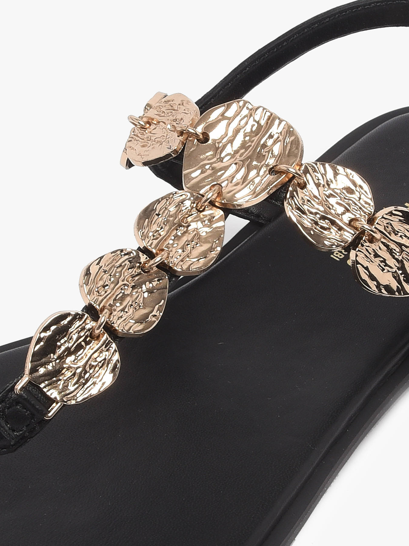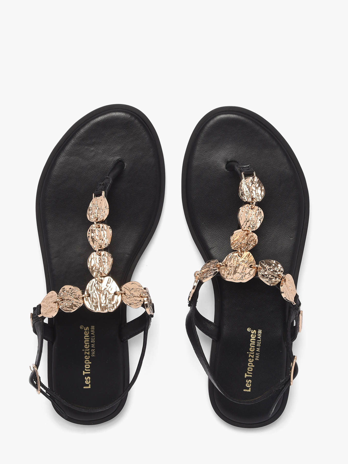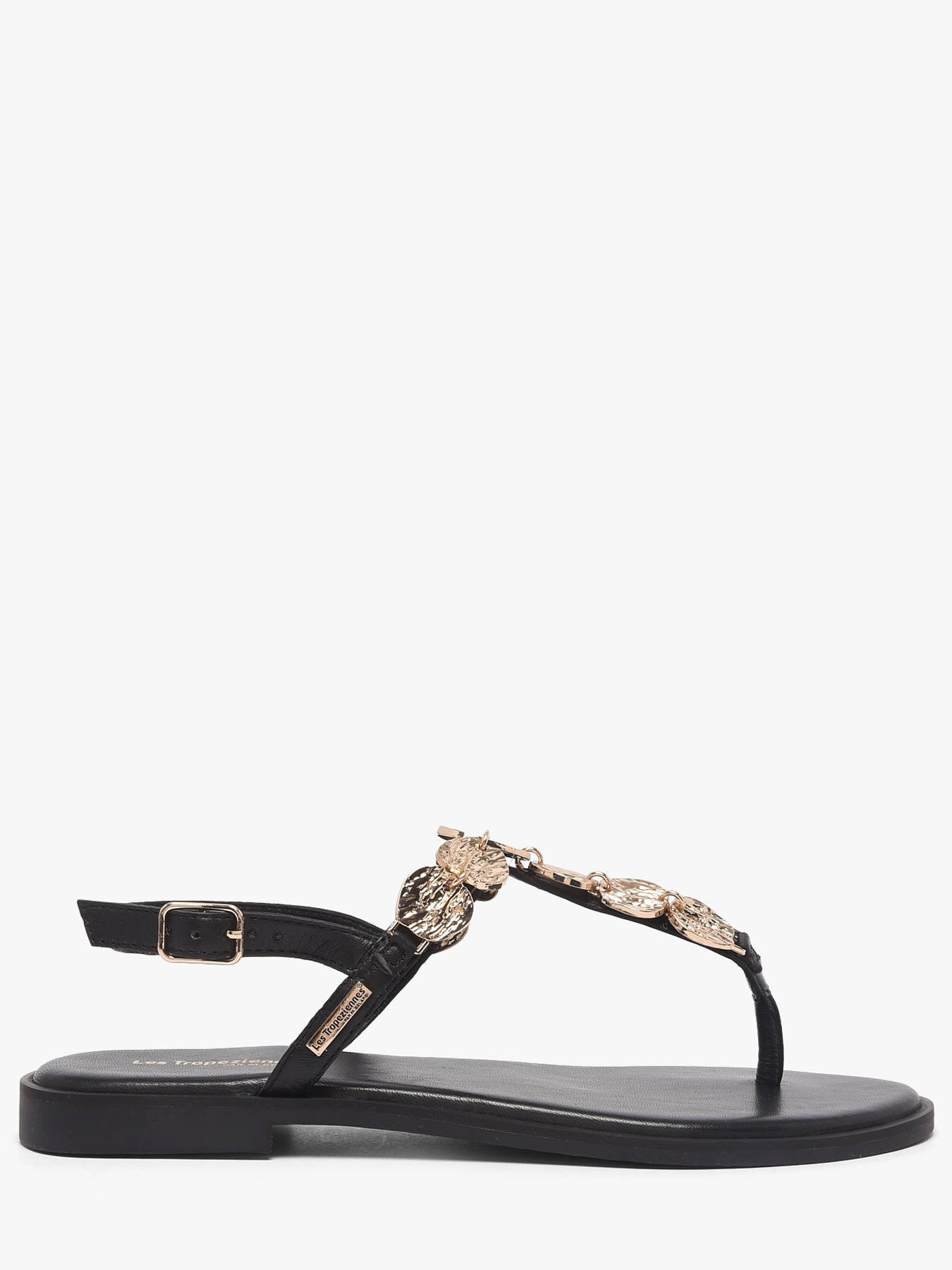 The ORTEGA flat sandals by LES TROPEZIENNES stand out with their refined elegance and luminous design, perfect for elevating summer outfits. Crafted from leather with an iridescent finish, they offer a feminine and sophisticated silhouette that pairs easily with many looks. The gold-tone decorations, featuring textured hammered-style discs, subtly catch the light and add a precious, on-trend touch to the design. Their delicate strap enhances the foot with a chic and minimalist appeal. The leather lining and leather insole ensure optimal comfort and a pleasant feel throughout the day. The buckle closure allows for a precise and secure fit, providing excellent support. Elegant and comfortable, these sandals are a summer wardrobe essential for women.