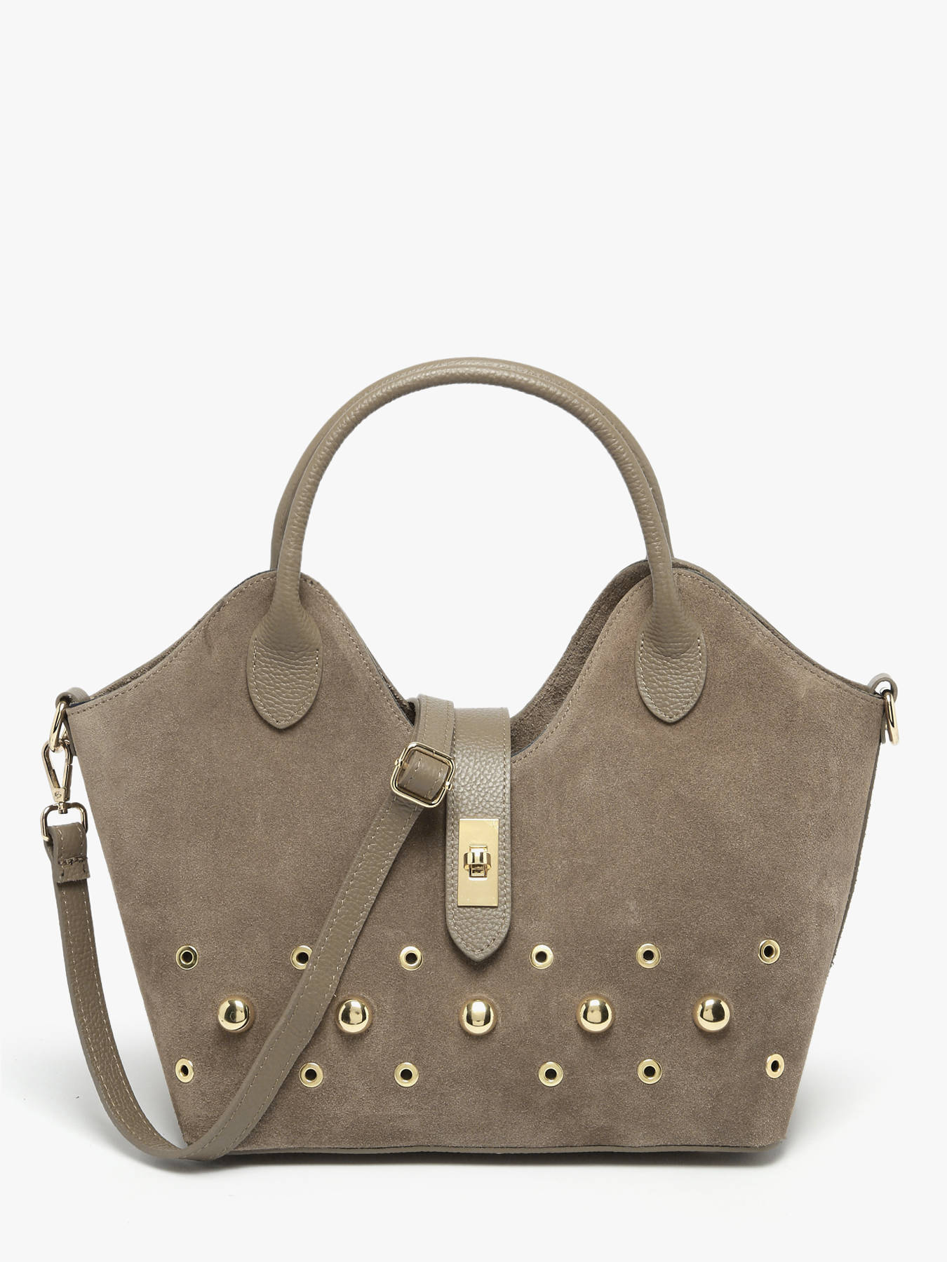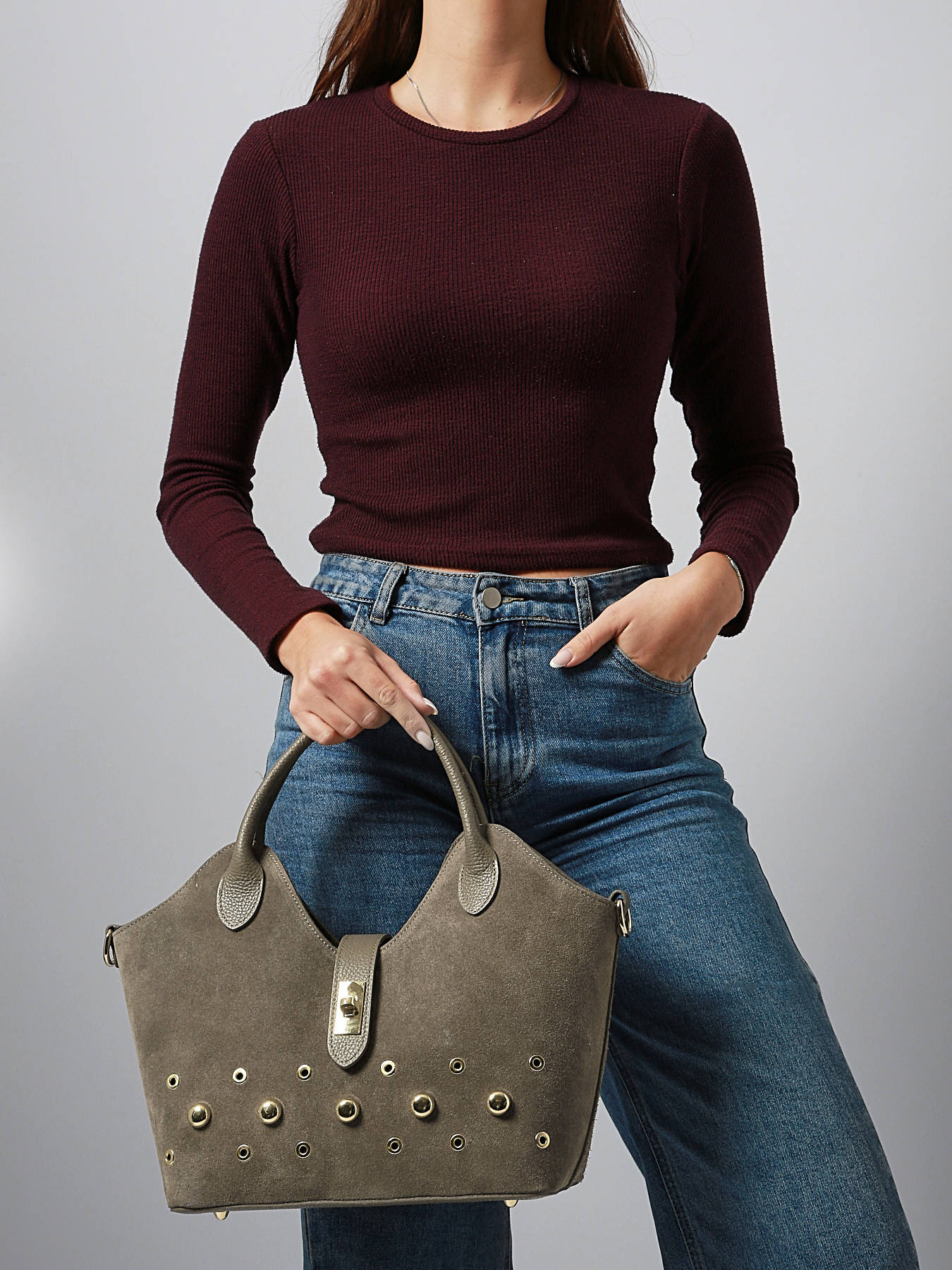 The MILANO VELVET STUDS handbag, available in four colors, combines bold style and elegance with its suede cowhide leather; the exterior features a flap-and-clasp closure, ensuring security and sophistication, while the 17 cm handle drop allows comfortable hand, shoulder, or crossbody wear thanks to its adjustable, removable strap, and the practical interior includes a main compartment and a zip pocket for efficient organization of your essentials; compact yet functional, the MILANO VELVET STUDS handbag stands out for its refined design and versatility, offering a chic, modern accessory that perfectly complements any outfit, from everyday wear to more formal occasions.