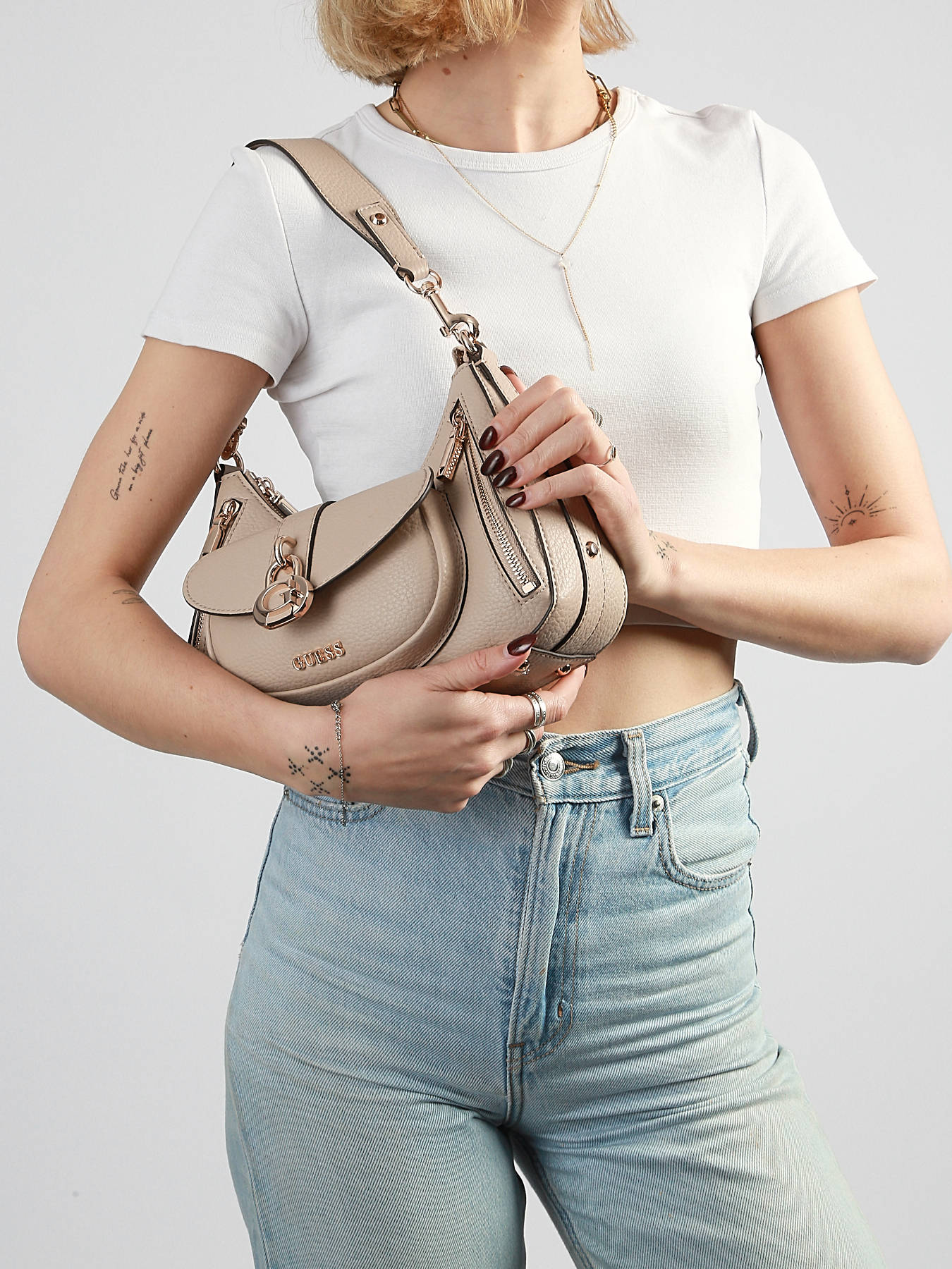Le sac porté épaule JESSA GUESS en P.U allie élégance, confort et fonctionnalité pour un look raffiné au quotidien. Son extérieur structuré dispose de trois poches avant et d’une poche au dos, parfaites pour garder vos essentiels à portée de main. La fermeture zippée sécurise vos affaires tout en facilitant l’accès rapide à vos effets personnels. Avec une hauteur de anse de 28 cm, il se porte confortablement à l’épaule, offrant une silhouette chic et pratique pour vos déplacements urbains. À l’intérieur, un compartiment principal organise vos affaires, complété par une poche zippée et trois emplacements pour cartes bancaires, permettant de garder vos indispensables bien rangés et facilement accessibles. Léger et polyvalent, ce sac accompagne vos tenues de jour comme de soirée avec style et sophistication. Ses finitions en P.U apportent une touche contemporaine et chic, faisant de ce sac un accessoire à la fois pratique et esthétique, idéal pour vos routines quotidiennes et vos sorties.