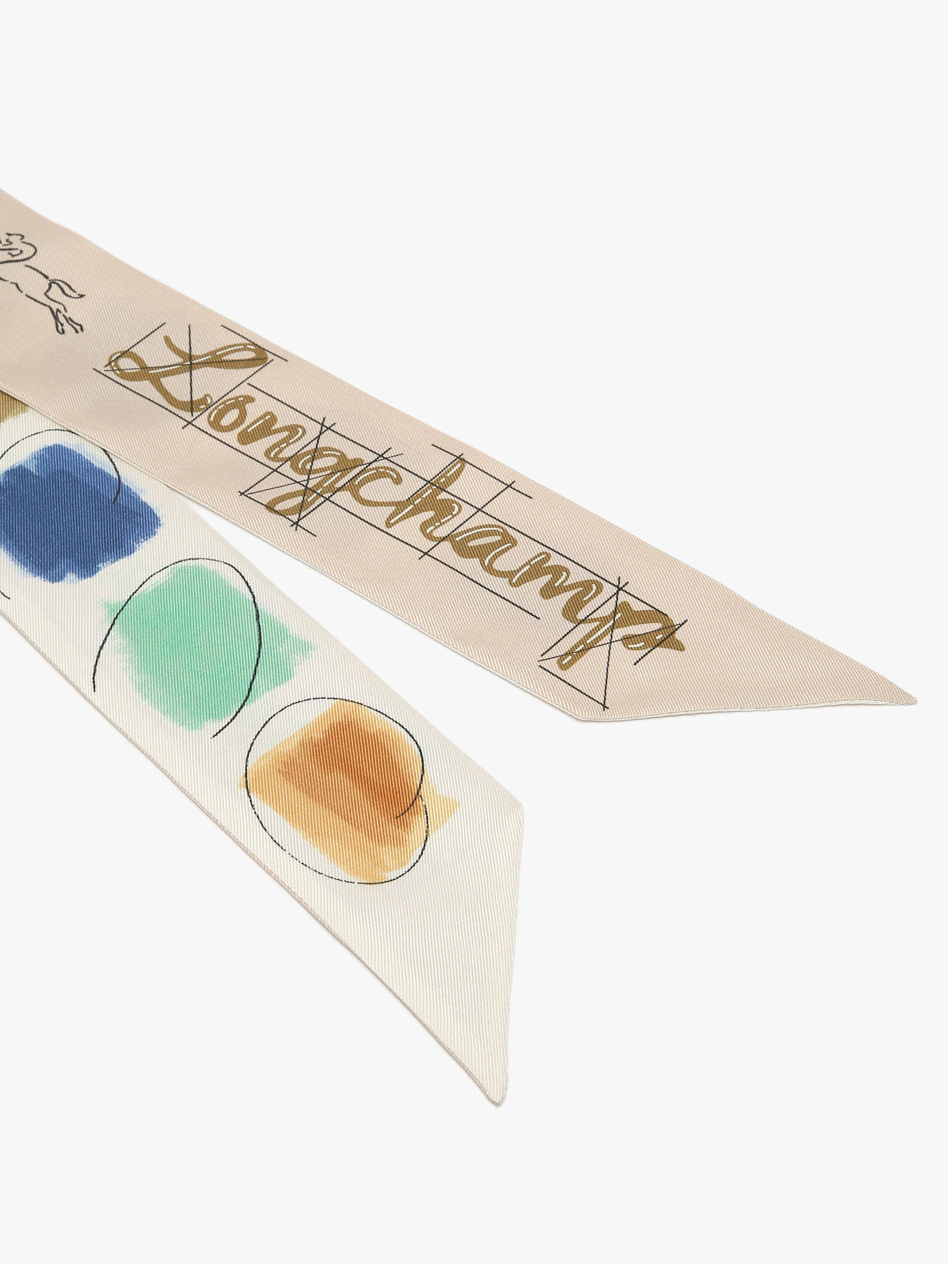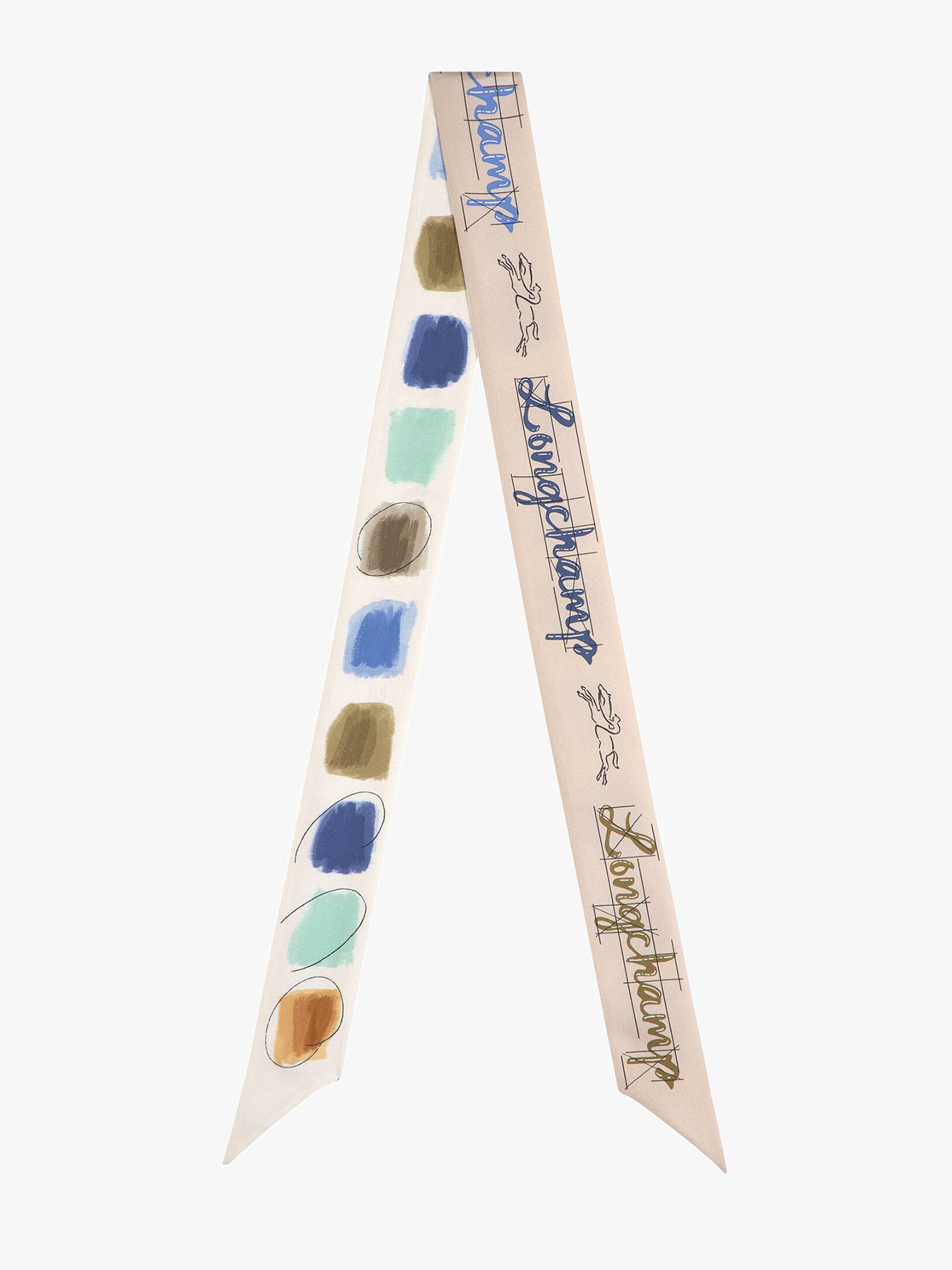 The La Palette headband from Longchamp, made of silk, measures 120 x 5 cm. It is directly inspired by the painter’s palette, featuring a series of delicate watercolor touches decorating the fabric. This silky composition offers a soft touch and elegant drape, perfect for enhancing any hairstyle. The soft and natural color palette echoes the ceramic tones at the heart of the collection, bringing perfect harmony to your outfit. Versatile, this headband can be worn around the head, tied on a bun, or even attached to a bag for a refined touch of elegance. Its artistic design and quality craftsmanship make it a unique accessory, combining femininity and creativity.