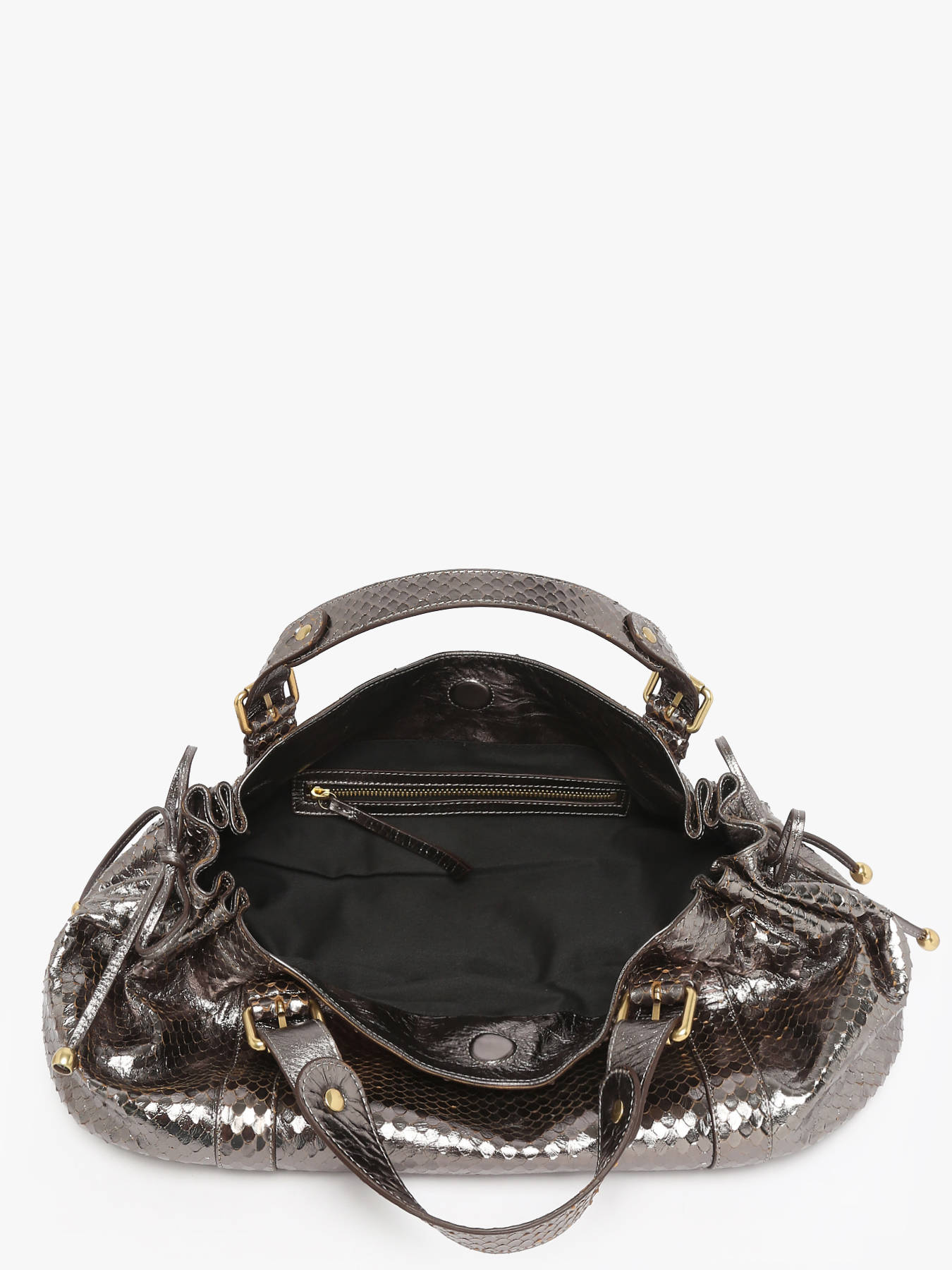 The SERPENT shoulder bag by GERARD DAREL embodies the brand’s bold elegance and contemporary sophistication. Crafted from metallic cowhide leather with a python-effect texture, it stands out for its luxurious look and unique feel—both supple and subtly glossy. Chic yet festive, this model transitions effortlessly from day to night, enhancing any outfit with a touch of glamour. Its magnetic closure allows quick and easy access while maintaining a refined silhouette. With its 16 cm handle, it offers a comfortable and feminine shoulder carry. The spacious, well-organized interior features a main compartment and a zipped pocket to keep your belongings secure. The SERPENT bag by GERARD DAREL is the perfect accessory for those who seek to combine modernity, glamour, and practicality in their everyday style.