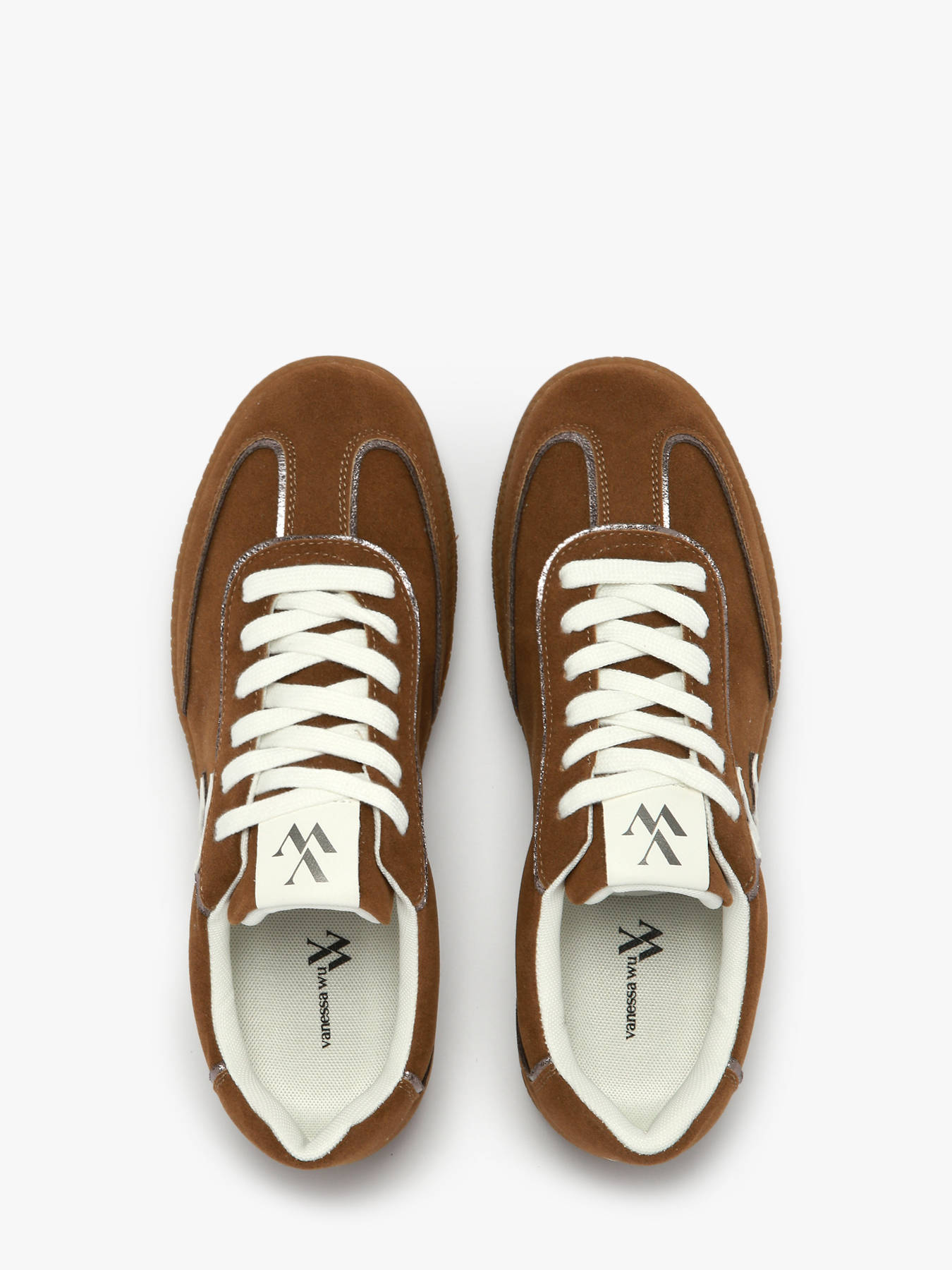 Fall for the Sarah monogram sneakers by Vanessa Wu, a perfect blend of retro style and modern comfort. Made in gold textured faux leather or dark camel split suede with a white monogram, they add elegance and originality to any outfit. Available in camel or gold, they suit every look. The removable microbead insole and slim stitched retro camel sole provide all-day comfort, support and lightness. This model fits true to size, take your usual size or go up for half sizes. Perfect for a chic yet casual style, these sneakers are a must-have from Vanessa Wu’s collection.